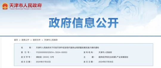 2024年7月8日,天津市發布《天津市促進現代服務業高質量發展實施方案》。要求加快平臺建設,發揮市對區平臺經濟支持政策作用,推動生產性、生活性服務領域平臺經濟持續規范健康發展。《方案》指出,圍繞網絡貨運、靈活用工、循環經濟物流、互聯網銷售、居民生活服務等領域,支持現有平臺企業拓展業務范圍,在津布局區域總部